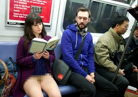 Ratusan penumpang kereta bawah tanah (subway) new york, dengan santai mencopot rok dan celana panjang, minggu (9/1/2011), saat ambil bagian dalam acara memperlihatkan kaki secara spontan, meski suhu membeku.