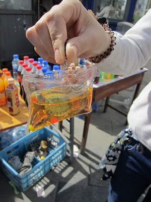 Menurut sebuah laporan berita di media China, tren baru di China adalah tentang penjualan ikan hidup, kura-kura Brazil atau salamander raksasa muda yang ditaruh dan disegel di kantong plastik kedap udara layaknya gantungan kunci. Setiap paket sekitar 7 cm panjangnya dan diisi dengan air berwarna bersama dengan hewan dipenjara. para penjual PKL ini mengklaim air berwarna itu kaya nutrisi, tetapi ternyata tidak. Tanpa oksigen dan makanan hewan bisa hidup hanya untuk beberapa hari, jika mereka beruntung. Bagian yang paling menyedihkan adalah bahwa hal itu adalah praktek legal di China.